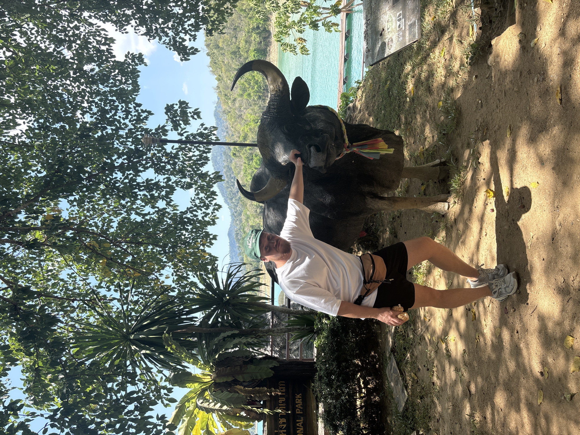 A Caucasian man in a white t-shirt, dark shorts, gray sneakers, and a green baseball cap poses with a statue of a gaur in Khao Sok National Park, Ban Ta Khun, Thailand