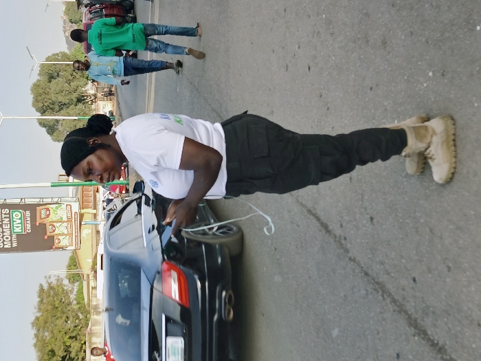 The scene depicts an outdoor urban setting on an asphalt road in Gweru, Zimbabwe, during daylight hours