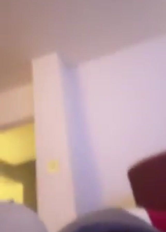 A person wearing a gray hooded sweatshirt, with their face filling the frame, begins to drink from a mug. The mug has a snowman design on it. The person’s skin appears fair. The background is blurred, but it appears to be an interior setting with light-colored walls. The lighting is somewhat dim and has a purple hue. There is some audio, including a person's voice in the background.