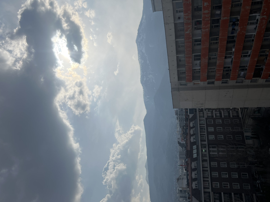 The image presents an elevated panoramic view of Sofia, Bulgaria, featuring the Vitosha Mountain range in the background. The sky is partially overcast with cumulus clouds, and direct sunlight penetrates through the cloud cover in the upper right, casting visible rays. The Vitosha peaks exhibit significant snow cover. In the foreground, a prominent multi-story residential building occupies the right side, characterized by a light-colored facade and weathered, reddish-orange balcony panels. Laundry is visible drying on multiple balconies of this structure. To the immediate left, a darker-toned, multi-story building with a pitched roof and numerous rectangular windows is discernible. The midground consists of a dense urban landscape comprising various multi-story buildings. No individuals or specific actions are clearly identifiable within the frame.