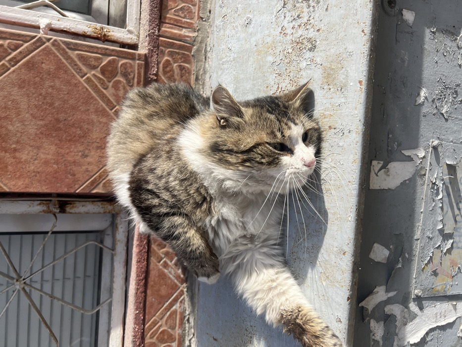 A long-haired tabby and white cat is depicted lying on its left side, stretching its left front paw forward on a weathered, light grey surface. Its head rests on the surface, eyes partially closed, with prominent white whiskers. A distinct notch is visible on the apex of its left ear. The cat's fur exhibits brown, grey, and white patterning. Directly behind the cat, a reddish-brown tiled surface with an embossed pattern is visible, forming a ledge beneath a window. The window features partially closed horizontal blinds and an external white metal security grill with a geometric pattern. The window frame and adjacent metalwork show significant rust and wear. The grey surface in the foreground displays extensive flaking paint and adheres to fragments of paper. The scene is illuminated by direct sunlight from the right. This situation is observed in Varna, Bulgaria.