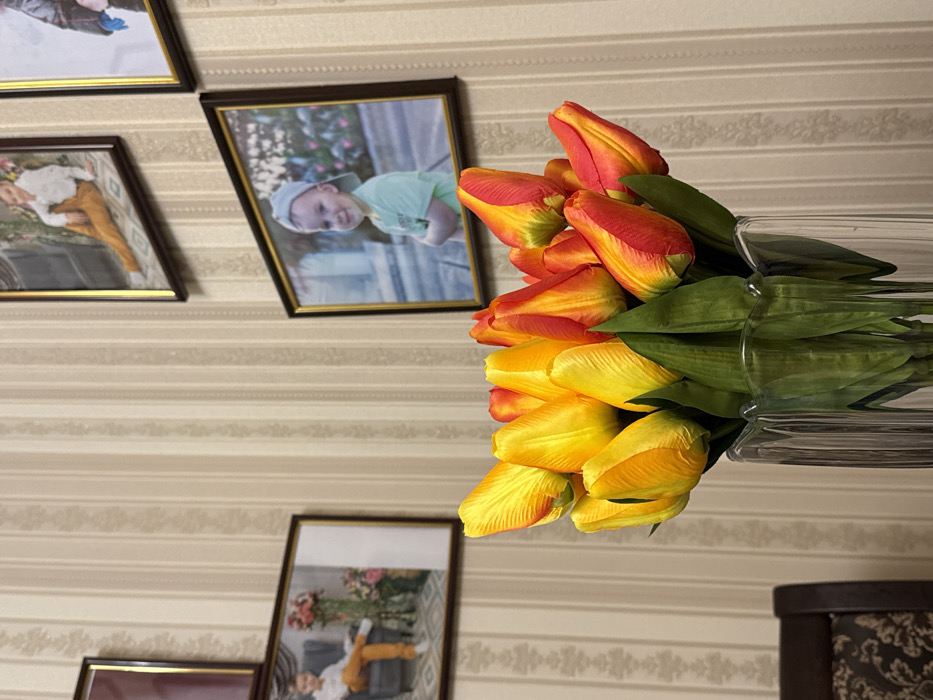 The scene depicts an interior residential space in Makiivka, Ukraine. In the foreground, a clear, fluted glass vase contains a dense bouquet of artificial tulips. The tulips exhibit a color transition from bright yellow at their bases to vibrant orange and red at their petal tips, accompanied by green artificial leaves. The background consists of a wall adorned with vertically striped wallpaper, featuring alternating wider beige stripes with a subtle floral-scroll pattern and narrower plain beige stripes. Several framed photographs are mounted on this wall. Prominently positioned above the tulip bouquet and slightly to the right is a horizontally oriented framed photograph depicting a young boy, possibly a toddler, wearing a light-colored cap and a light green t-shirt, smiling with his arms crossed in an outdoor setting with foliage. To the left of this, another horizontal framed photograph shows an older boy, approximately 5-8 years old, seated in an upholstered chair, wearing light-colored pants and a white shirt, with floral arrangements beside him. Higher and towards the top right of the frame, a third horizontal framed photograph portrays an infant or very young child. Additional partially visible framed images are present on the far left and top right corners of the wall. In the lower left quadrant of the image, the dark wooden backrest and patterned upholstery fabric of a chair or similar furniture item are partially visible. No live individuals are present in the immediate observable scene.