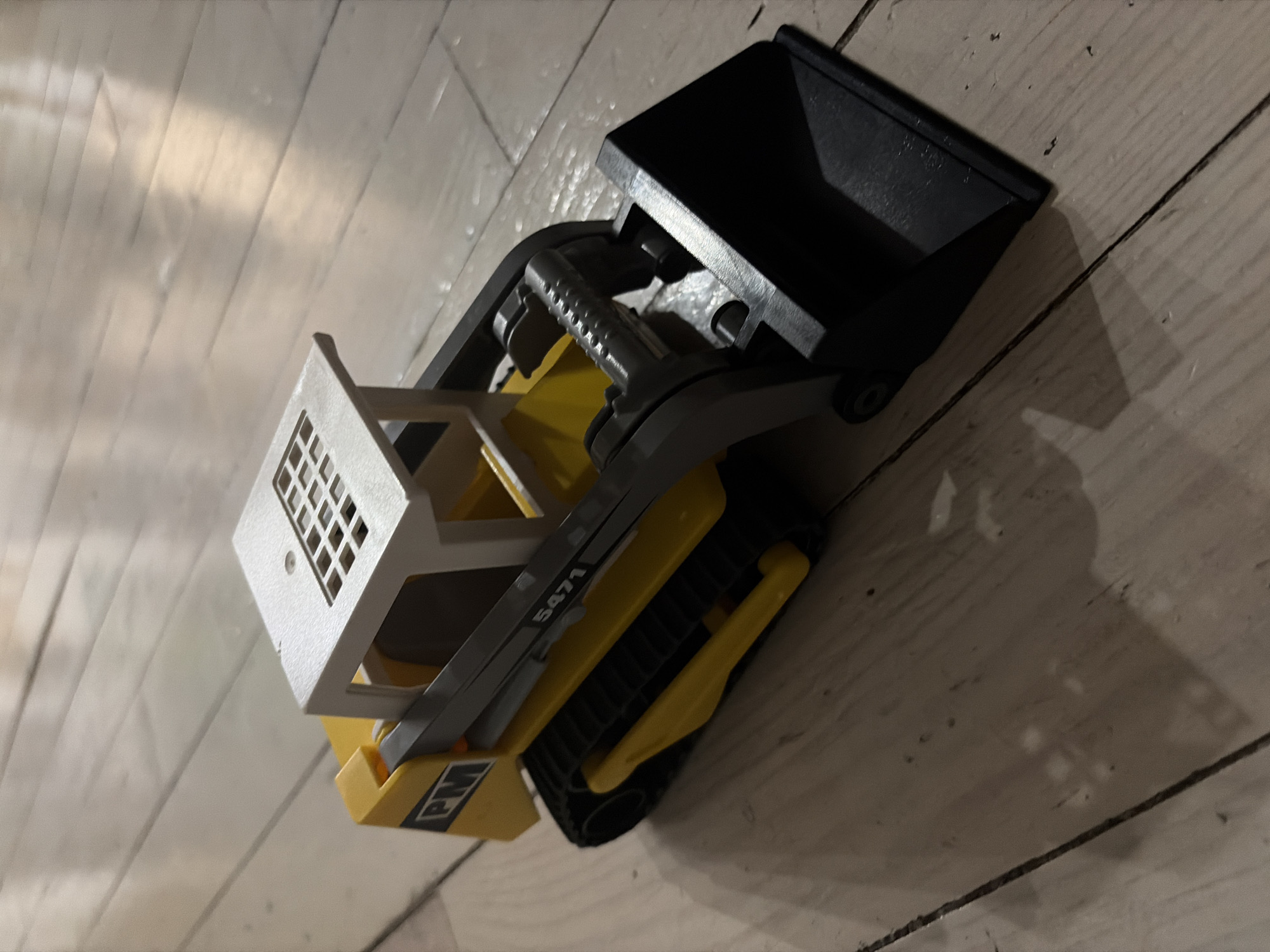 The image depicts a toy construction vehicle, specifically a track loader, on a light-colored wooden floor with visible grain. The vehicle is primarily yellow and black, with a white cabin frame. "5471" is printed on the side, and "PM" is on the rear. The setting is unknown and therefore a location in the city of Pétange, Luxembourg cannot be determined.