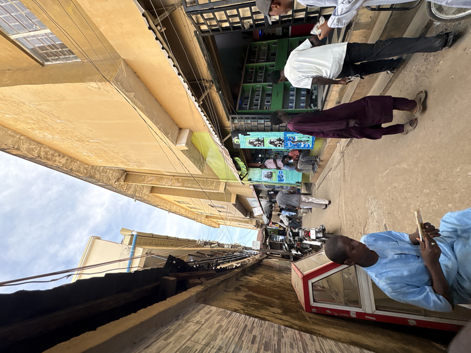 The image depicts a bustling commercial alleyway in Jos, Nigeria, under a bright, cloudy sky