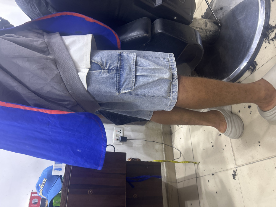A person sits in a barber chair, draped with a blue and red cape. They wear denim shorts and white slides. Hair clippings scatter on the tiled floor around the chair. An electrical outlet with a connected device is visible near a wooden dresser, with a yellow tape measure extending across the floor. A blue baseball cap sits on top of the dresser.