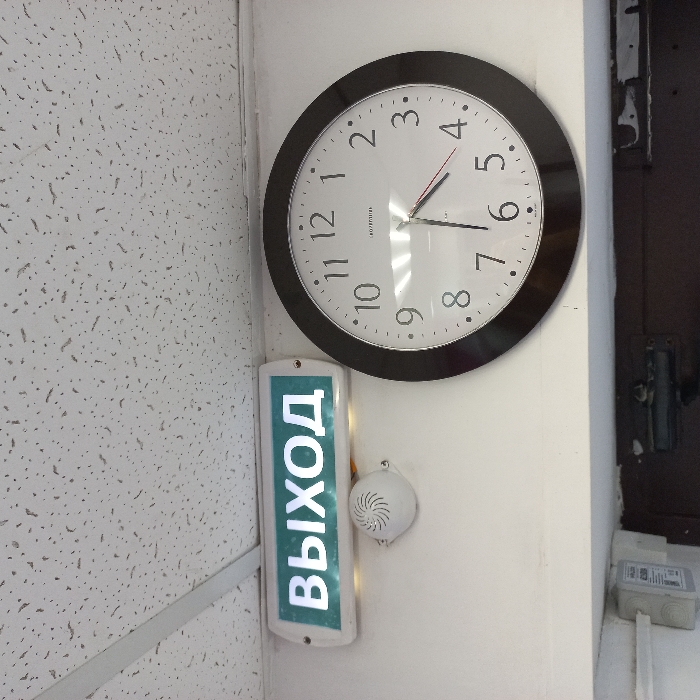 This image depicts an interior scene within an unidentified commercial or public building located in Ново-Никольское, Russia. The upper portion of the frame is dominated by a white acoustic tile drop ceiling featuring a visible grid and textured surface. Mounted on a light-colored wall below the ceiling are three distinct objects. On the left, a rectangular, illuminated sign displays the Russian word "ВЫХОД" (EXIT) in bright white characters against a green background. Two small, yellowish lights are visible directly beneath this sign. Below the exit sign, a small, white, circular device with a spiral grille pattern is mounted, consistent with an alarm sounder or speaker. To the right of these, a large, circular analog wall clock with a dark brown or black bezel and a white face is prominently displayed. The clock, branded "ВОЗРОЖДЕНИЕ," indicates the time as approximately 4:32:15, with the hour hand just past the numeral 4, the minute hand positioned at the 32-minute mark, and the red second hand pointing to the 3 (15 seconds). The lower edge of the image reveals a dark, horizontal surface, likely the top of a door frame, and a light-colored electrical box on the bottom left. No individuals or specific actions are depicted.