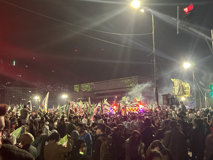The image captures a dense nighttime gathering of a large crowd in an urban street within Al-Qanawat Municipality, Syria