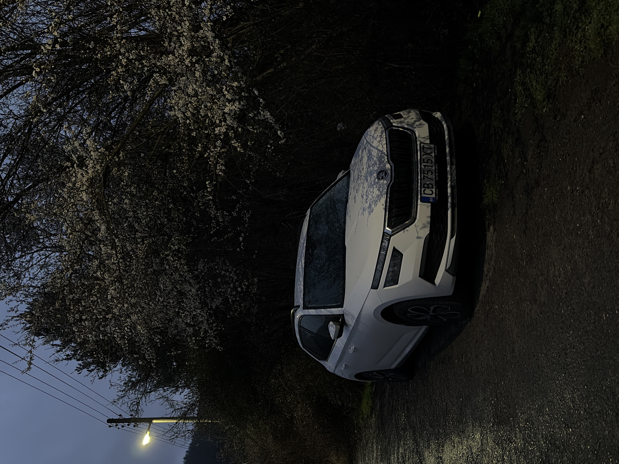 A white Skoda SUV with the Bulgarian license plate "CB 7515 XT" is parked on a dark, narrow road