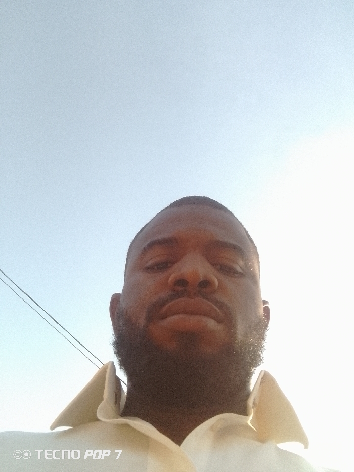 A man with dark skin and a full beard looks down into the camera, filling the lower half of the frame. He wears a light-colored collared shirt. Above him, a clear blue sky dominates the background. A faint power line is visible in the upper left. The image appears to be taken outdoors in bright daylight. The bottom left corner displays "TECNO POP 7," indicating the phone used to capture the image.