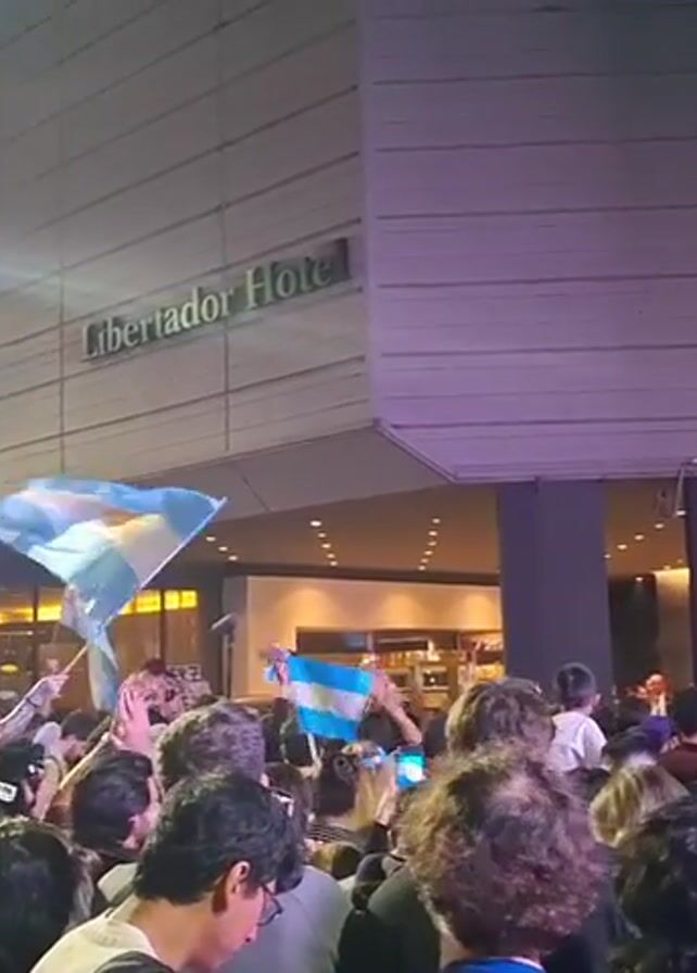 A large crowd has gathered in front of the Libertador Hotel at night. The crowd holds and waves Argentina's national flag. Most are holding up phones, presumably taking pictures or video. The hotel is brightly lit. A street sign is visible, but the text is too small to make out.