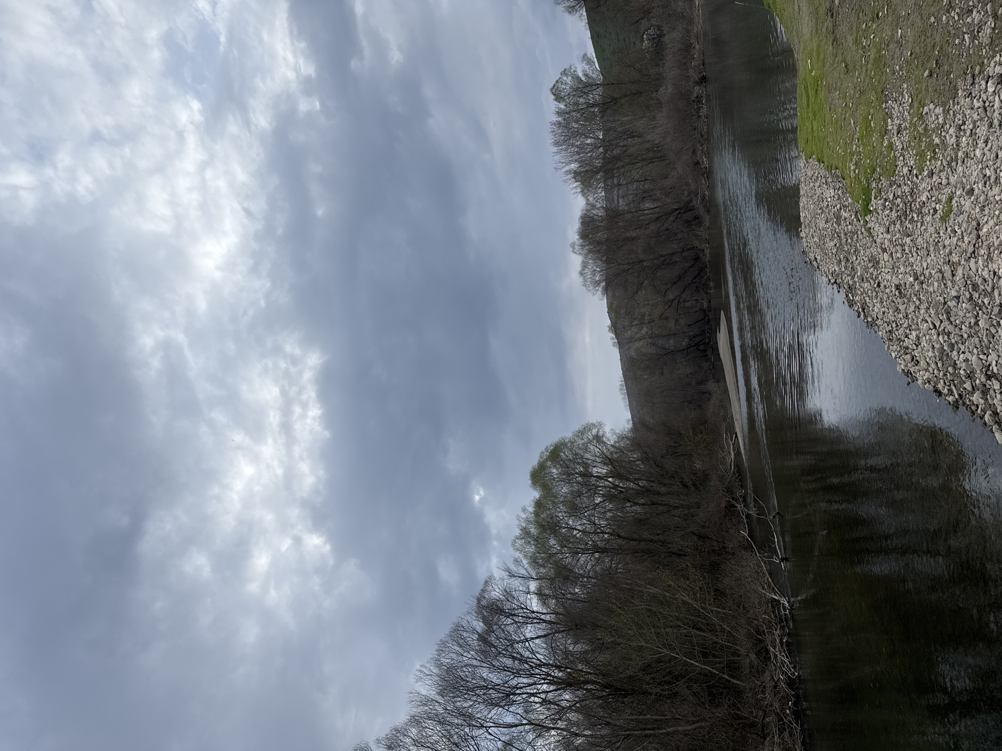 The image displays a river landscape located in Orashac, North Macedonia, under an overcast sky. The upper portion of the frame is dominated by a dense, grey cloud cover exhibiting patches of brighter illumination. A wide, dark-surfaced river occupies the middle ground, reflecting the grey sky and the surrounding environment, with visible ripples across its surface. The far bank (viewer's left) is densely forested with deciduous trees, predominantly bare or in the early stages of budding with sparse green foliage. Fallen tree branches and natural debris are partially submerged in the river along this bank. A sandbar or shallow bank is discernible on the far side of the river, slightly to the left of the image center. Beyond the immediate tree line, low, gently sloping hills with sparse vegetation rise towards the horizon. The near bank (viewer's right) features a substantial stretch of small to medium-sized grey river stones and pebbles, which transition into a patch of vibrant green grass growing on a dirt slope in the extreme lower right foreground. No individuals, animals, or artificial structures are present within the scene. The overall lighting is diffused, consistent with an overcast day, and the state of the vegetation suggests late winter or early spring.