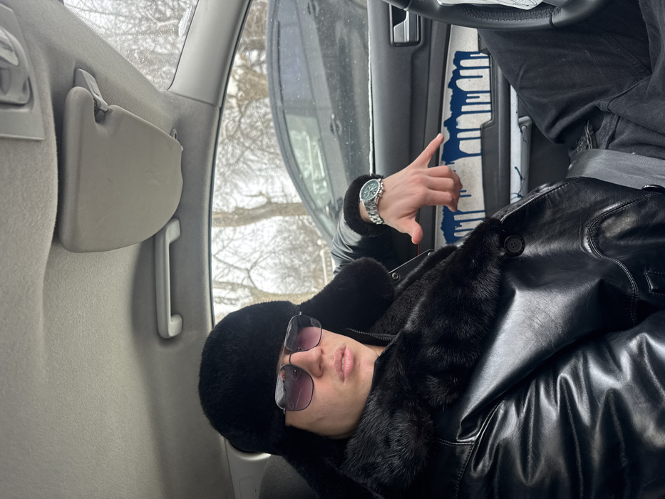The image depicts a male individual seated in the driver's seat of a vehicle, in Chaikovsky, Russia, with an outdoor winter or early spring environment visible through the windows. The subject is a male, estimated to be young adult, wearing a black fur ushanka hat with ear flaps down. He wears rectangular aviator-style sunglasses with gradient-tinted lenses, obscuring his eyes. His attire includes a black leather jacket featuring a prominent black fur collar and lapels. A silver-colored wristwatch with a visible green dial is worn on his left wrist. His right forearm rests on the car's door panel, with his index finger extended, pointing towards a section of the panel. His expression is neutral with his lips slightly parted. The car's interior features a light-colored (beige or grey) headliner and sun visor on the passenger side, which is in the upright position. A grab handle is located above the passenger window. The driver's side door panel, where the subject's arm rests, is customized with a white or light-colored insert displaying multiple blue paint drips along its lower edge. A portion of a black steering wheel is visible on the far right of the frame, along with a seatbelt secured across the subject's lap. Through the car windows, the exterior environment shows bare deciduous trees with visible branches against an overcast sky. The ground appears to have a light, possibly snowy or frosted, covering. A dark-colored sedan is partially visible in the background, positioned beyond the trees.
