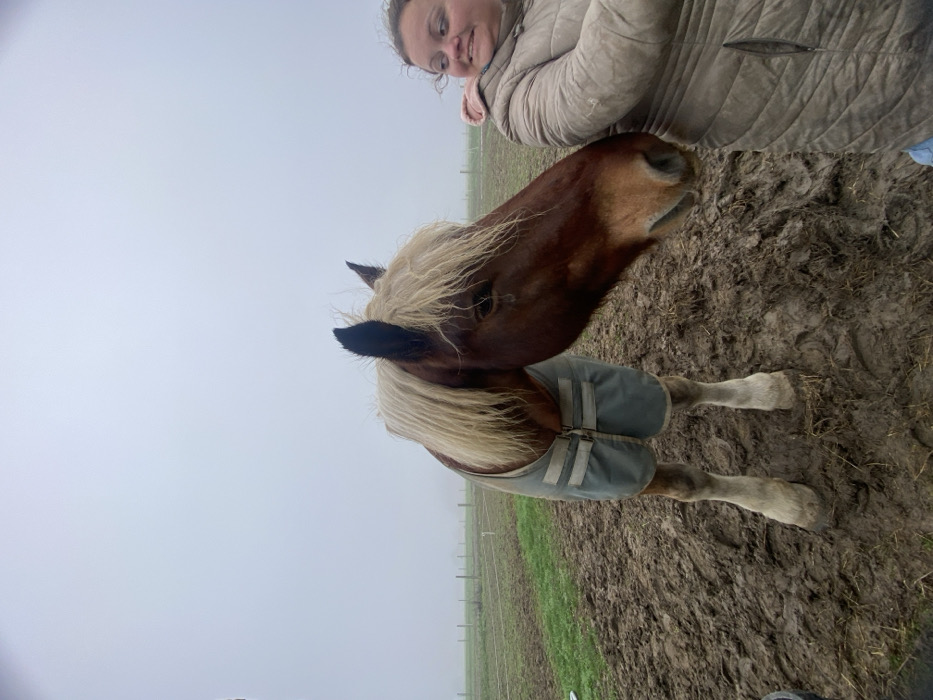 The image depicts a rural scene in Estaimpuis, Belgium, featuring one horse and one female individual. The foreground consists of heavily churned, dark brown mud. A brown horse, with a light blonde mane and forelock, is positioned slightly left of center, facing the camera with its head angled downwards. Its lower legs are light-colored. The horse is wearing a light grey or light blue horse blanket secured by two horizontal straps. To the right of the horse, partially visible, is a woman. She has light hair and is wearing a light-colored, possibly tan, quilted jacket. Her head is turned to her left, looking towards the horse, and she exhibits a slight smile. The background shows a flat, green field with multiple thin, white fence lines or wires stretching horizontally across it. The sky is completely overcast and heavily fogged, obscuring any distant features or horizon. The overall lighting is dim and diffuse due to the atmospheric conditions.