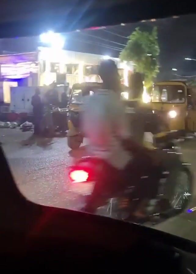 From the perspective of the inside of a vehicle at night, the video shows a street scene with several yellow motorized three-wheeled vehicles, often called "tuk-tuks