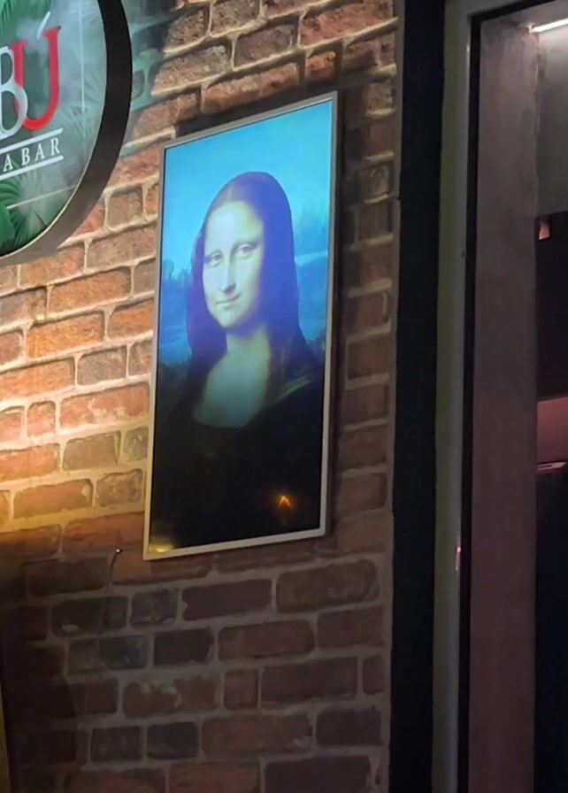 n interactive artwork featuring the Mona Lisa painting, displayed on a wall made of reddish-brown bricks. To the left of the painting is a circular sign reading "ABUJ SHABAR". To the right, a dark window reflects what seems to be the interior of a building or room. The interactive portion of the painting changes from the regular artwork to the Mona Lisa drinking from a blue cup. The audio contains indistinct speech and music.