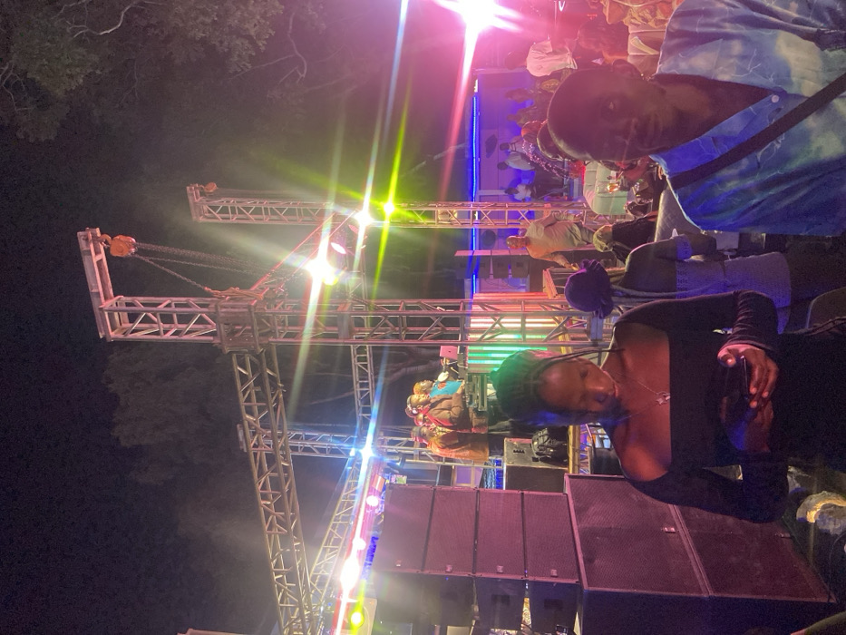 A nighttime outdoor event features a metal stage structure with rigging and lighting. Speakers are stacked on the ground. Two people are in the foreground; one wearing a black top and the other wearing a blue shirt. A crowd of people can be seen in the background on the stage. The event appears to be lively with various colored lights.