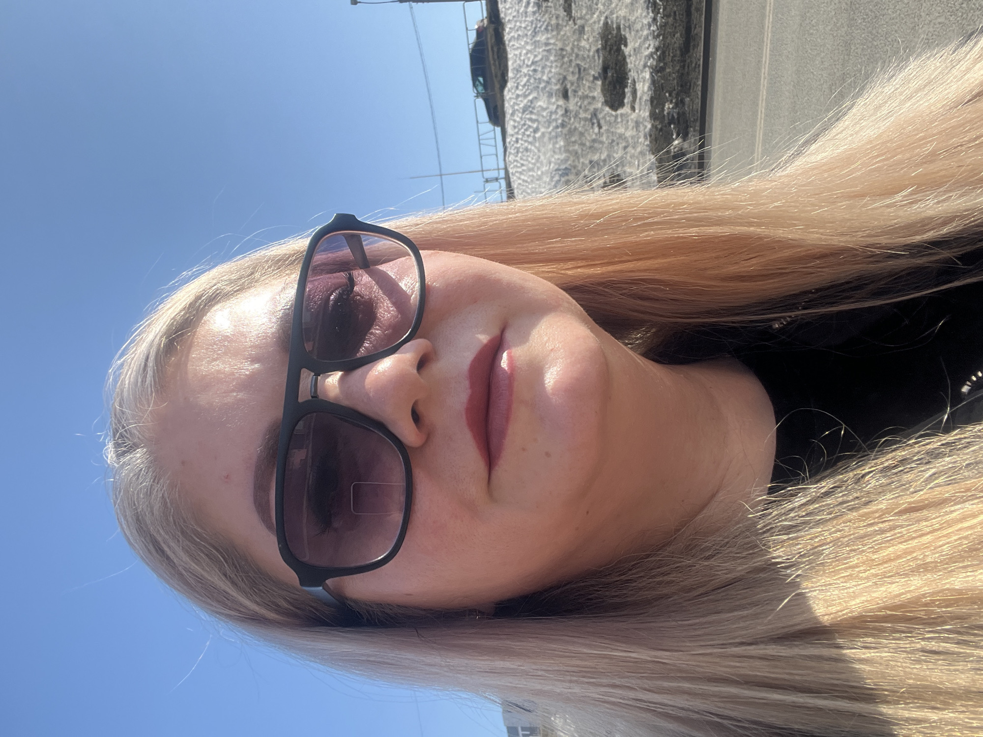 A woman with long blonde hair is wearing sunglasses. She is standing outdoors, with a blue sky visible in the background. Part of a building or structure is visible in the background. The location is Izhevsk, Russia.