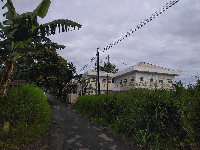 The image depicts a narrow, cracked asphalt road winding through a verdant environment in the city of Chan-Nua, Laos, under an overcast sky. In the foreground, dense green vegetation lines both sides of the road. On the left, a banana plant with large, partially torn leaves dominates the upper left quadrant. On the right, thick tall grasses and foliage rise alongside the road, with a section of barbed wire fence partially visible within the greenery. In the midground, a two-story, white building with a distinctive reddish-brown hip roof and projecting eaves stands elevated on the right side of the road. The building features multiple rectangular windows with dark frames and horizontal gold-colored decorative bands or patterns beneath them. A utility pole with multiple black power lines originates near the road and extends diagonally across the upper right portion of the scene, passing over the white building. Beyond the immediate vegetation on the left, other structures or fences are partially visible, surrounded by additional trees. No individuals, vehicles, or animals are present.