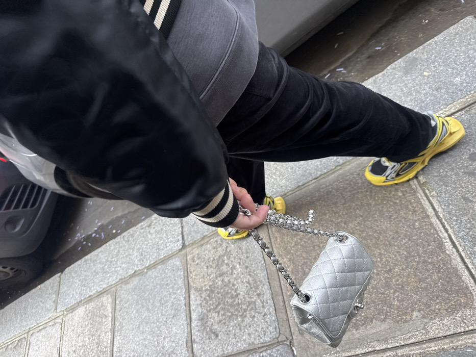 An overhead perspective captures a partial view of an individual standing on a grey stone-paved sidewalk in Paris, France. The subject wears a black satin-finish bomber jacket with black and off-white striped cuffs, a grey crewneck sweatshirt underneath, black velvet or velour trousers, and bright yellow and black athletic shoes. Their right hand holds a small, silver-colored, diamond-quilted handbag featuring a metallic chain strap. A silver-toned charm, resembling a stylized letter 'L' and embellished with small white beads, is attached to the chain. The environment consists of a sidewalk paved with rectangular grey stone blocks, typical of Parisian streets. Adjacent to the sidewalk, a dark-colored vehicle is partially visible, with its tire resting near the curb. Small, light-colored specks of debris are scattered on the asphalt surface between the curb and the vehicle.