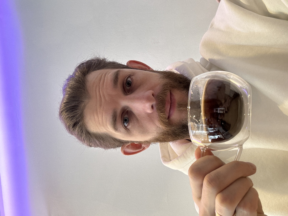 An adult male with light skin, brown hair, a brown beard, and blue eyes is depicted in a close-up, self-portrait style photograph taken in Zelenogradsk, Russia. He wears a light-colored hooded sweatshirt and holds a clear, double-walled glass mug containing a dark liquid in his left hand. A metallic ring is present on his left ring finger. He looks directly into the camera. The background is a plain, light-colored wall with a horizontal strip of purple ambient lighting visible along the top edge.