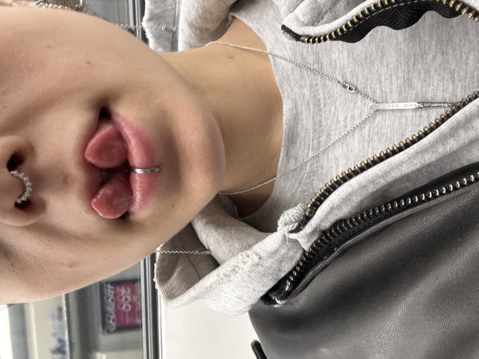 A close-up image depicts an individual from the chest up, focusing on the lower face, including the mouth, nose, and upper chest. The individual has a bifurcated (split) tongue, with both halves partially extended from the mouth. A silver ring, consistent with a labret piercing, is present on the lower lip. The nose features a silver septum piercing adorned with multiple small, clear stones. The individual is wearing a light gray hooded sweatshirt under a black leather jacket; both garments are partially unzipped, exposing parts of their zippers. A silver ball chain necklace with a rectangular pendant, engraved with "TOPLE HOS," is visible around the neck. A thin silver chain earring is partially visible on the right side of the image. The background is blurred, revealing a white display unit or refrigerator on the left, containing an item with faint Russian text including "БОЛЬШОЙ" (Big) and the number "200." The scene is an indoor environment, likely a commercial establishment, in the city of Saint Petersburg, Russia.