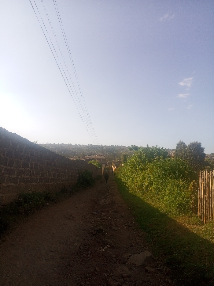 The image displays a dirt path in Kiamaina ward, Kenya, under a clear, light blue sky with minimal cloud cover