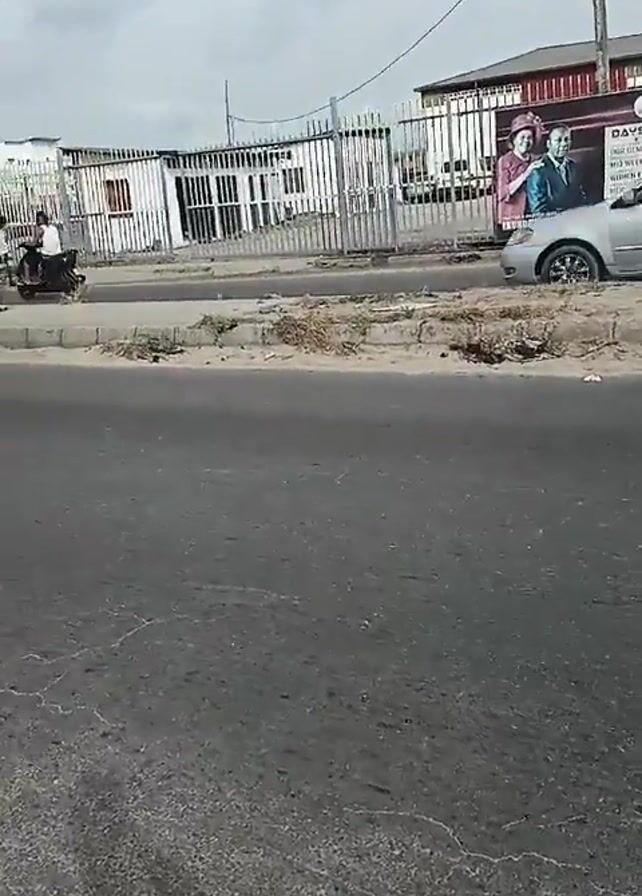 street scene in what appears to be a developing country. The street is asphalt, patched and faded, with a sandy shoulder. The sky is overcast. Vehicles, including cars, auto rickshaws (tuk-tuks), and motorcycles, are seen moving along the road. The sidewalks are partially paved, and there are buildings and fences along the sides of the road. Power lines and poles are visible overhead. A large advertisement for a religious event is displayed on a fence. The overall impression is of a busy, somewhat chaotic, urban environment.