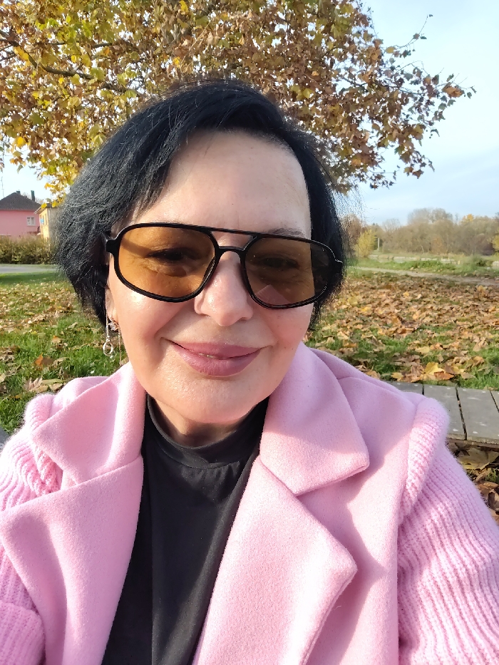 A female individual is depicted in a close-up, outdoor portrait taken in Souffelweyersheim, France. She has short, dark hair and is wearing dark-framed aviator-style sunglasses with amber-tinted lenses. Her lips exhibit a pinkish hue, and she is smiling. She wears a light pink coat featuring lapels and ribbed or knitted sleeves, over a dark, high-necked garment. A silver-toned dangle earring is visible on her left ear. The background shows autumn foliage, including a tree with yellow-brown leaves directly behind her head and the ground covered with fallen brown and yellow leaves. To the viewer's left in the background, a light pink building with a dark roof is partially visible. The distant background on the right reveals open terrain with additional trees under a pale blue sky. A wooden plank structure is partially visible on the far right. The scene is consistent with an outdoor park or green space during the autumn season.