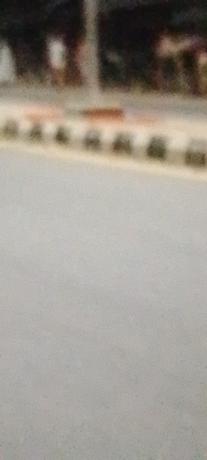 The image depicts an extremely blurry and grainy outdoor scene within the city of Zango-ndaji, Nigeria. The lower two-thirds of the frame are dominated by a flat, light grey, textured surface, likely pavement or a road. Above this, in the midground, a horizontal linear feature is visible, characterized by a lighter strip with repeating darker, indistinct shapes, possibly representing a curb or low barrier with small, dark elements. The upper portion of the image, forming the background, consists of heavily blurred, dark, amorphous forms, preventing any identification of specific structures, vegetation, or individuals. Due to the severe lack of focus and resolution, no discernible people, subjects, objects, specific actions, or interactions can be identified. The environment appears to be an urban or semi-urban streetscape.