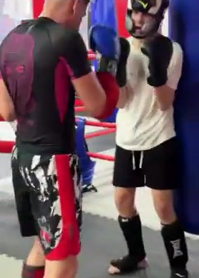 Two men spar in a gym. The man on the left is wearing red gloves, black and red shorts, a black shirt with a portrait on the back, and red foot protectors. He's punching the man on the right. The man on the right is wearing black gloves, a black helmet, a white t-shirt, black shorts, and black foot protectors. The gym has boxing rings in the background.