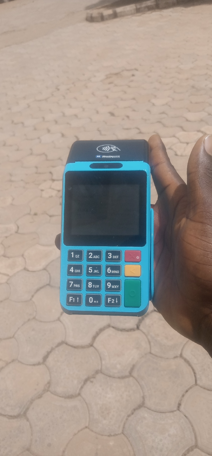 A close-up image displays a teal blue and black Maxitpoint business terminal, a portable point-of-sale (POS) device, held by a dark-skinned human right hand