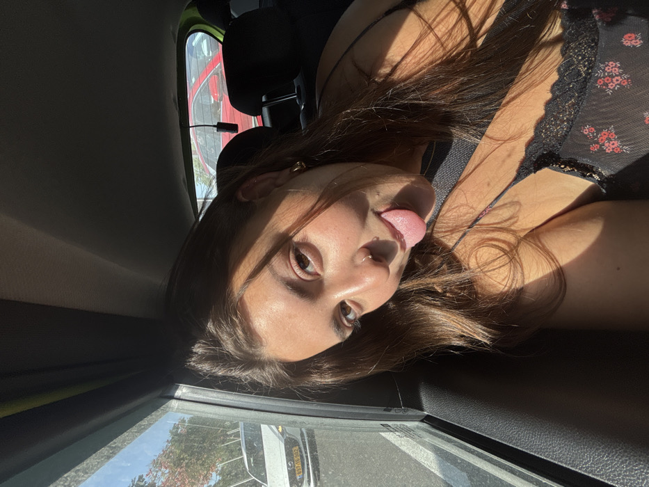 The image displays a young adult female seated in the rear passenger compartment of a vehicle, positioned in Rishon LeZion, Israel. She has long brown hair, a nose piercing, and a visible gold hoop earring on her right ear. Her facial expression includes her tongue extended towards the camera, maintaining direct eye contact. She is wearing a dark-colored spaghetti-strap top with lace trim and a red floral pattern. Direct sunlight enters the vehicle, illuminating parts of her face and right shoulder, casting distinct shadows. Through the vehicle's rear-left window, a white car with the Israeli license plate "897-19-902" is visible on a paved surface, accompanied by green foliage under a blue sky. A red vehicle is partially visible through the rear window of the subject's car. The interior of the vehicle is dark-toned, with a black headrest and a hanging charging cable visible in the upper right portion of the frame.