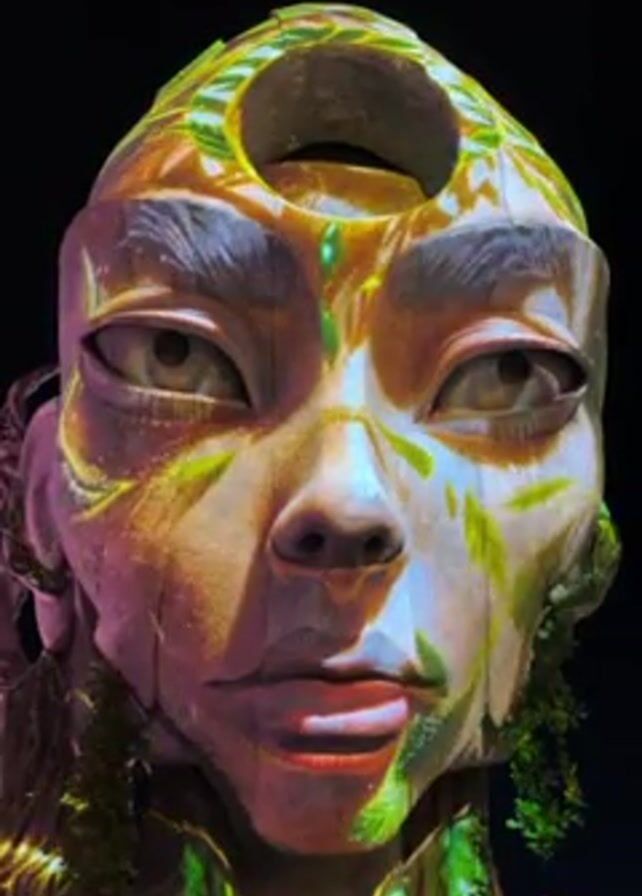 large, pale-skinned, humanoid figure with an opening in its forehead. The figure’s face is decorated with moving projections of leaves and light. The background is black. The face is expressionless and seems to be crafted from wood or a similar material.
