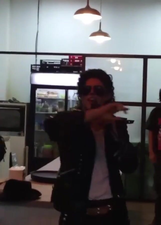 person dressed as Michael Jackson singing into a microphone. The person is wearing a black leather jacket, sunglasses, a white T-shirt, and black pants. A wide belt is around their waist. They are standing in a room with white walls and hanging lights. Behind them is a counter with a woman working. There is also a refrigerator and other kitchen equipment. Another person stands to the side. The Michael Jackson impersonator is holding the microphone close to their mouth and is gesturing with their other hand.