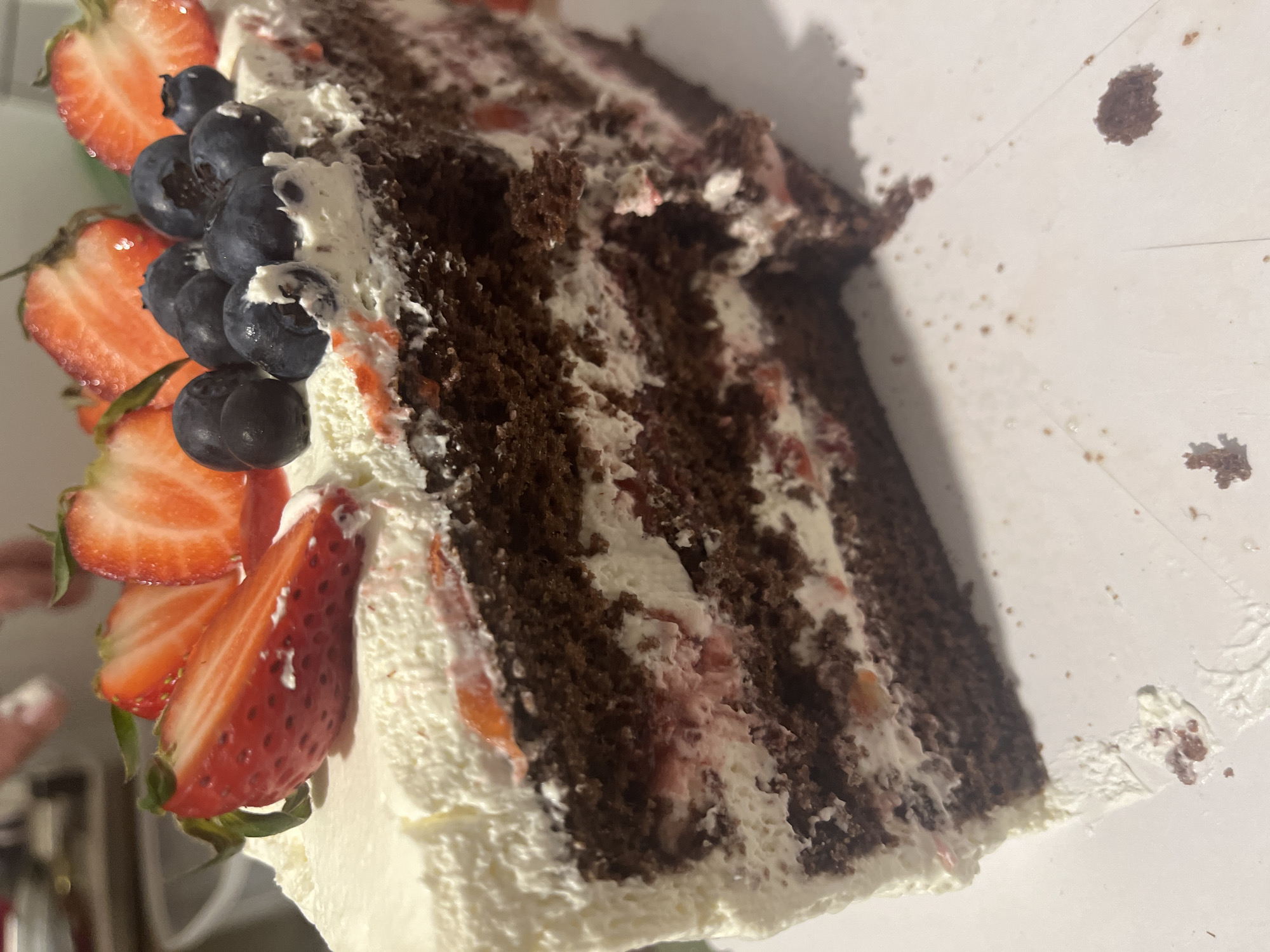 A slice of layered chocolate cake rests on a white surface, possibly a plate or countertop. The cake is decorated with fresh strawberries and blueberries along the front edge. The slice reveals multiple layers of chocolate cake alternating with white frosting and a strawberry filling. The environment is nondescript, with only a glimpse of what appears to be a kitchen setting in the background. There is no indication of the location being Rudartsi, Bulgaria, or any other specific city. No people are visible.