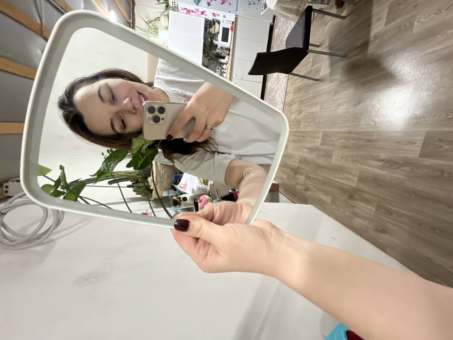 A woman's reflection is captured in a handheld, white-framed mirror