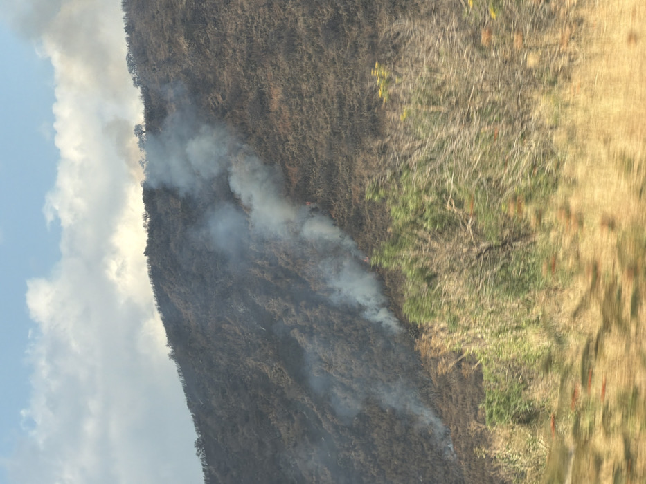 A hillside ablaze with wildfire ascends, smoke billowing across the dried vegetation. The left side of the image shows a hazy blue sky and a cloudy horizon. The ground cover transitions from charred patches to dry grass and greener areas further to the right. The photograph is off-kilter, presenting a tilted perspective of the natural landscape.