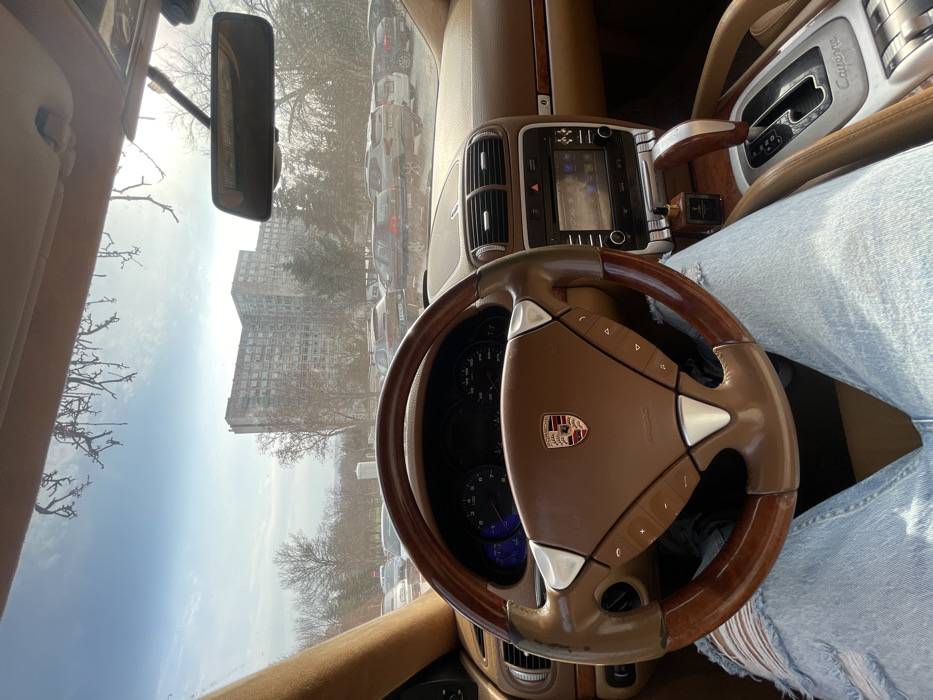 - "The image depicts an interior view from the driver's seat of a first-generation Porsche Cayenne, distinguished by its brown leather and wood trim, and a steering wheel bearing the Porsche crest" by FM-6IM2j2, licensed under CC BY 4.0