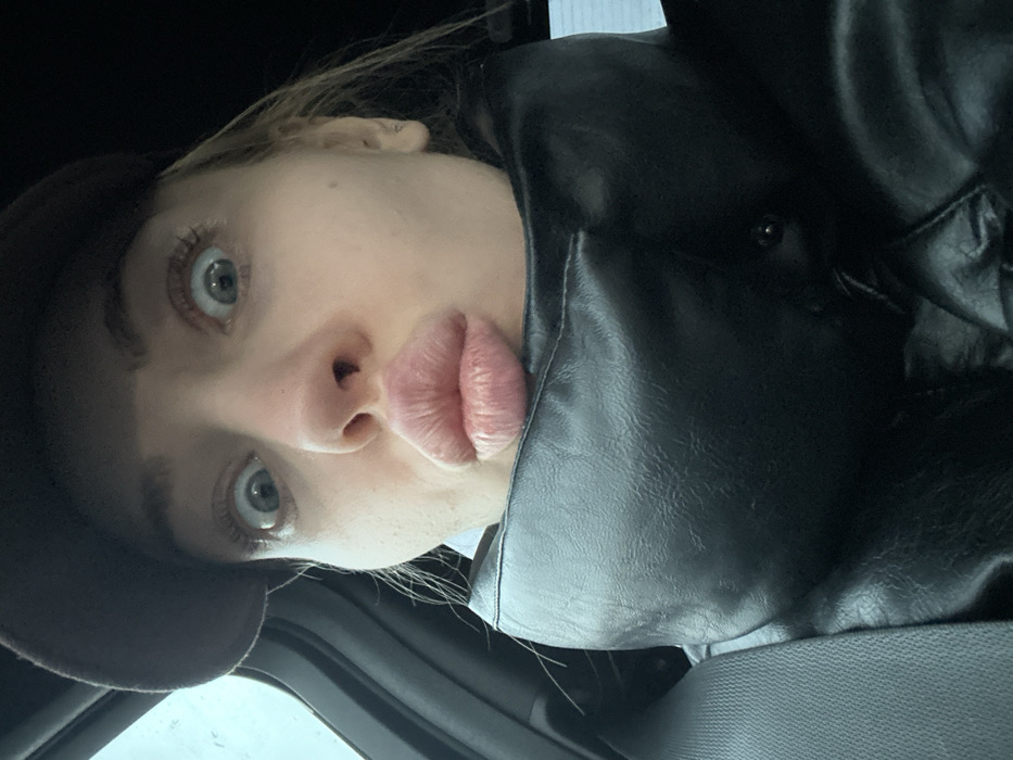A close-up photograph depicts a light-skinned individual, likely female, positioned inside a vehicle in Kudrovo, Russia. The individual is wearing a dark baseball cap and a black, high-collared, puffy jacket. A grey seatbelt strap is visible across the individual's left shoulder. The subject's face is centered, exhibiting wide-open eyes with light irises and puckered lips in an exaggerated expression. A minor dark speck is visible on the bridge of the nose. The immediate background on the left consists of a blurred, light-colored area, consistent with an overcast sky or exterior view through a vehicle window, bordered by a dark vehicle pillar. The background on the right is dark and indistinct, indicative of the vehicle's interior. The lighting is even and soft.