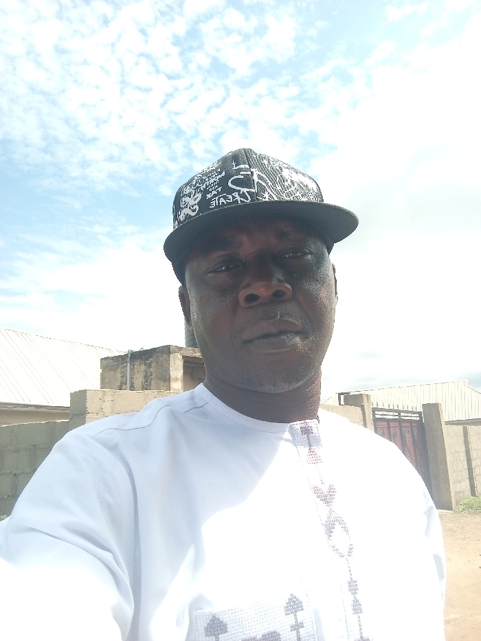 A male individual is depicted in a close-up portrait, facing the camera with a neutral expression. He wears a black and white patterned baseball cap with a flat brim, worn backward, featuring text including "CREATE." He is dressed in a white traditional tunic with red and grey embroidered patterns on the chest placket and pocket. The scene is outdoors in Zango-ndaji, Nigeria, under a bright, partly cloudy sky. In the background, fragmented views of urban structures are visible: a silver corrugated metal roof to the left, a weathered concrete block structure centrally, and a dark brown metal gate or door within a concrete wall to the right. The ground appears unpaved.