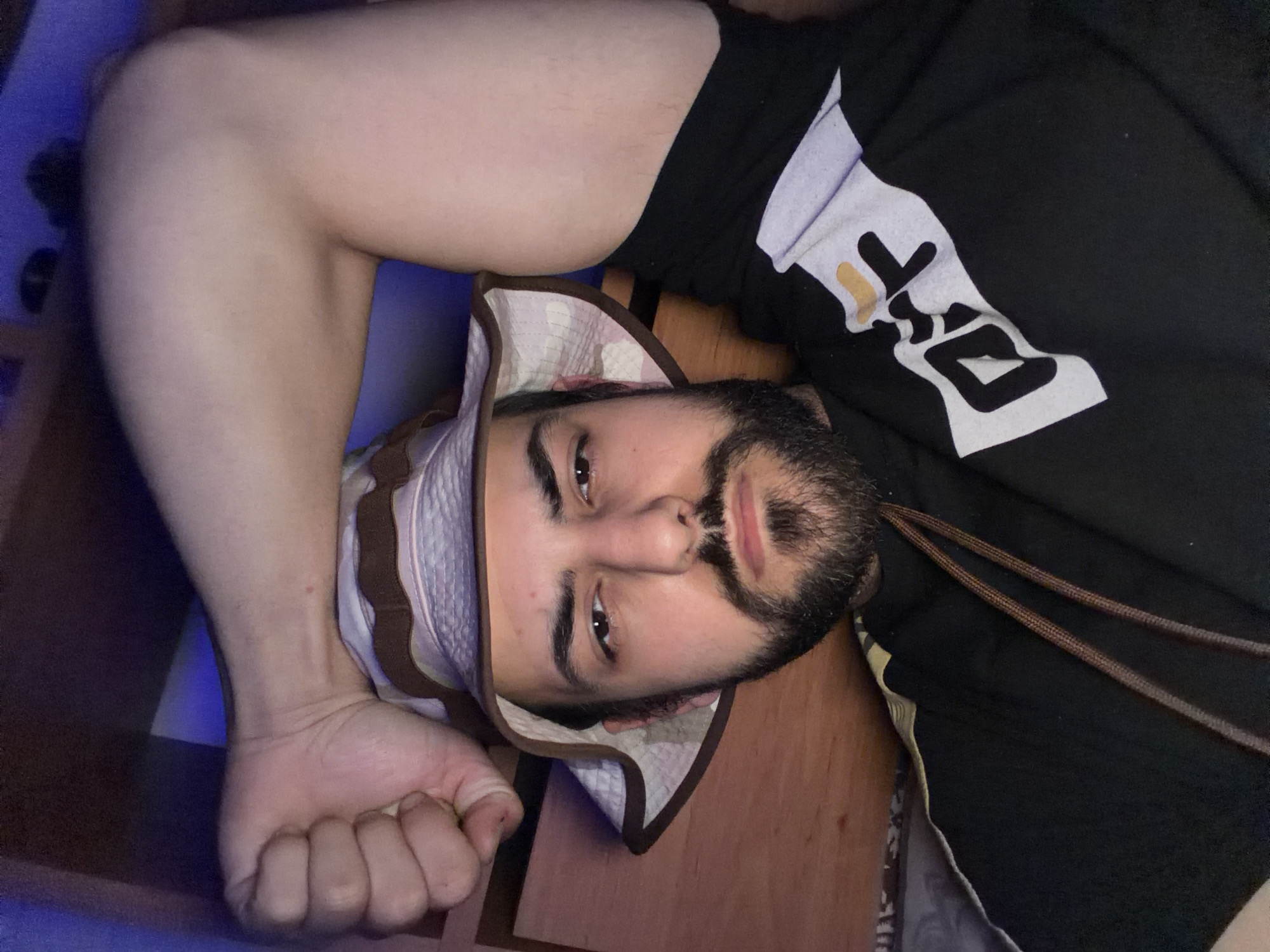 A medium shot depicts a person with light skin, a beard, and dark hair, wearing a bucket hat and a black t-shirt with a white and yellow design. The person is lying down with their arm raised and fist clenched. The background includes a wooden surface and a blue light source.