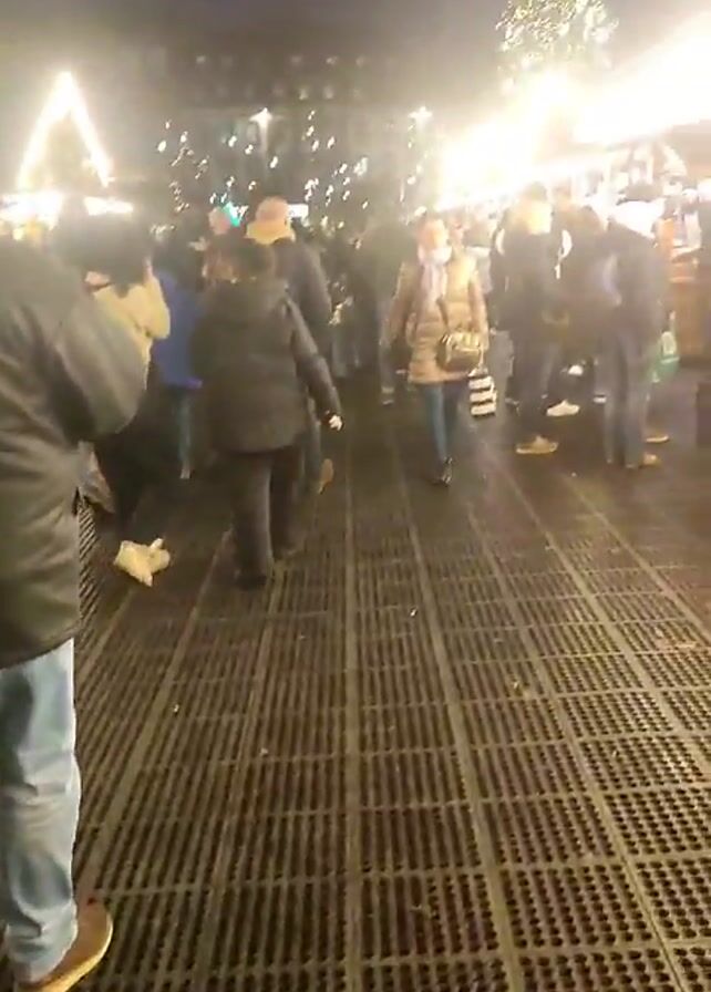The video depicts a bustling Christmas market scene at night. People stroll along a grated pathway. A brightly lit Christmas tree stands tall in the background. Market stalls are adorned with lights. The atmosphere is festive and crowded.