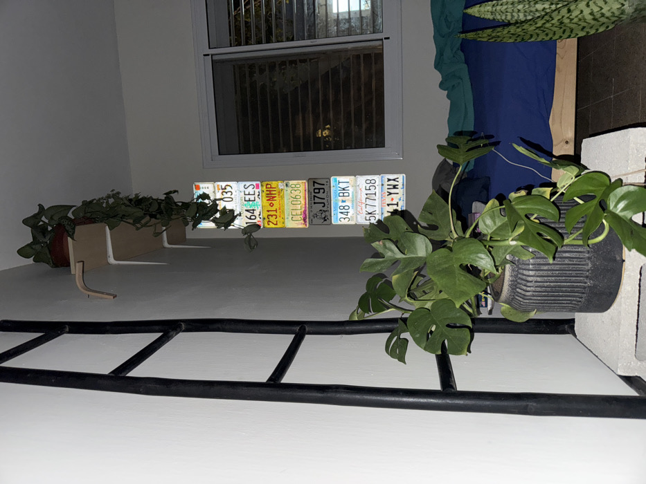 The image depicts an indoor residential room. No individuals are present. A black, three-rung ladder-like structure leans against a white wall on the left. In the lower-left foreground, a potted plant with large, deeply lobed green leaves is situated on a grey cinder block. The plant is contained within a dark grey, ridged pot. Above, a light-colored wooden shelf, secured by white brackets, is mounted on the white wall, holding a smaller potted plant with trailing green foliage. Below this shelf, a vertical stack of eight North American vehicle license plates is affixed to the wall, displaying alphanumeric combinations including "164 EES," "231 NHP," "CEL0638," "J797," "348 BKT" (from Yukon), "5K77158" (from California), and "41-YWX." On the right, a white-framed window with two sliding panes is visible, covered by dark horizontal blinds. Below the window, a bed with a wooden frame, a blue fitted sheet, and a teal blanket is partially visible. To the right of the bed, a tall snake plant is partially discernible in a pot. The room is dimly lit. The displayed license plates indicate a North American origin for some objects, and the image contains no visual information to suggest a location within Gilboa Regional Council, Israel.