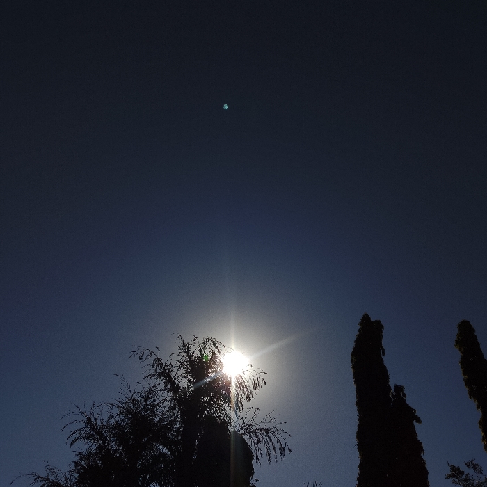The image captures an outdoor scene in Estômbar e Parchal, Portugal, under a clear, dark blue sky. The sun, exhibiting a pronounced starburst effect, is positioned low in the sky, partially obscured by the upper foliage of a silhouetted broadleaf tree with drooping branches located in the lower-left quadrant. To the right, two or more tall, slender trees, possibly cypresses, stand in dark silhouette against the bright light. A faint, small, light-blue circular artifact is present in the upper-left portion of the sky, consistent with a lens flare. No individuals or specific actions are visible within the frame.