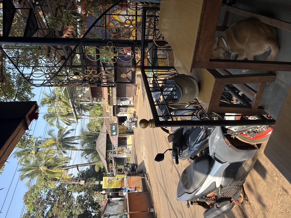 A street scene with a scooter parked near a table. A cat sits under the table. In the background, palm trees line a street with shops and other parked vehicles. A wrought iron gate with golden accents is also present. A helmet rests on the table near the scooter.