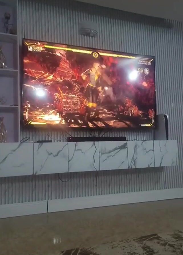 large flat-screen television displaying a scene from the Mortal Kombat game