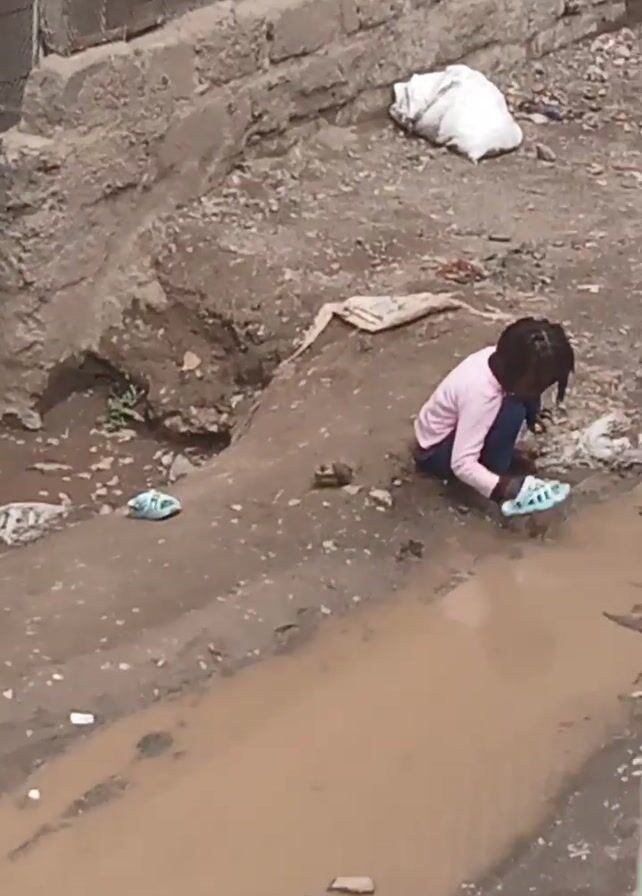 From an overhead perspective, the video captures a young person sitting on a dirt embankment near a puddle of muddy water