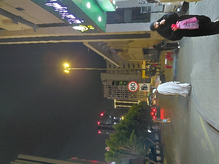 This is a nighttime street scene in an urban area of Makkah Al Mukarramah, Saudi Arabia. The view is looking down a street lined with buildings and illuminated by artificial light sources. In the immediate foreground, a woman dressed in a black abaya and head covering walks towards the left side of the frame on a light-colored paved sidewalk. She carries a translucent pink plastic bag containing visible items. To her right, a portion of a building with a brightly lit green storefront, featuring Arabic script and a gold logo, is present. Further into the midground, a man in a white thobe and a white ghutra walks away from the viewer, moving towards the left on the asphalt street. The street surface appears somewhat reflective, possibly from moisture. To his right, a red and white striped barrier marks the edge of the street. In the center-left of the midground, a circular speed limit sign displaying "80" in black against a white background with a red border is mounted on a pole, with a rectangular sign depicting a camera icon directly below it. Vehicles, including cars with illuminated headlights and red taillights, are visible on the street beyond the man. Pedestrians are also discernible on the sidewalks further down the street. One individual in a black abaya is visible on the far sidewalk to the right of a prominent streetlamp. The scene is dominated by multiple multi-story buildings on both sides of the street, ranging from modern high-rises with illuminated windows in the background to older structures. A tall, bright yellow-orange streetlamp positioned centrally provides significant illumination, creating lens flare. Green trees with visible foliage are situated on the left side of the street, partially obscuring buildings. The sky above is dark.