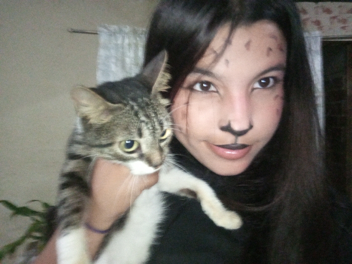- "In an indoor setting within Juan Griego, Venezuela, a young female subject with long dark hair and facial makeup simulating feline features (black nose, upper lip, and dark spots on forehead/cheeks) is holding a domestic cat" by FM-uUNwU2, licensed under CC BY 4.0