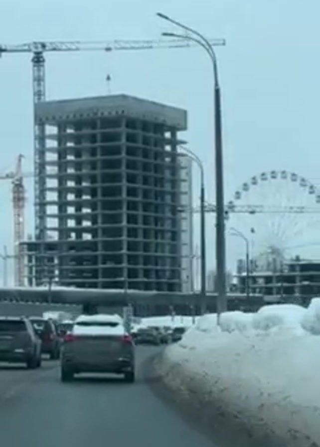 car driving on a snowy road with a view of a city skyline. In the background, there is a Ferris wheel and some buildings under construction, with cranes visible. The road has a pile of snow on the side. There are other cars on the road moving in the same direction. The sky is overcast, suggesting a cold, winter day. The video is taken from inside the car.